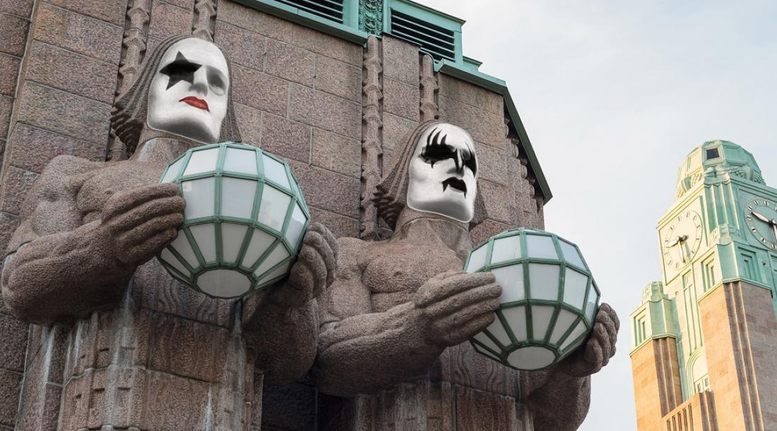 Хельсинки выразили свою любовь к группе KISS: гранитные статуи на центральном вокзале города раскрашены под макияж, в котором выступают музыканты.