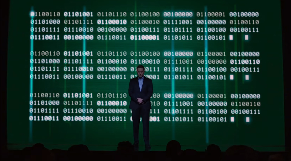 В трейлере «Кремниевой долины» показано публичное выступление предпринимателя Гевина Белсона (актер Мэтт Росс). На большом экране за его спиной изображена последовательность бинарного кода.