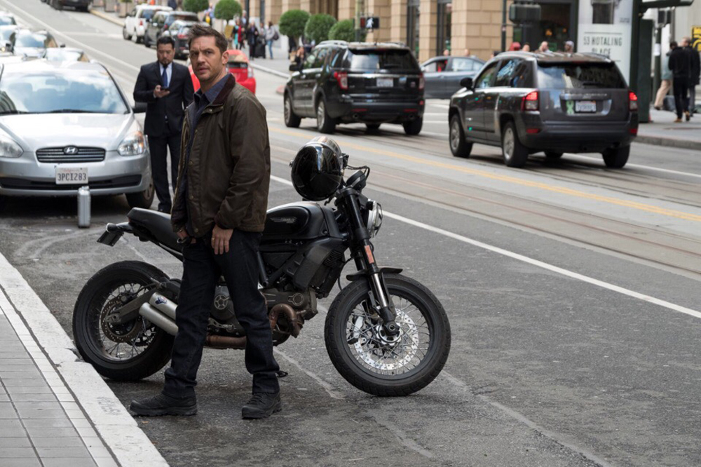 Собственно, на снимках засветился сам Харди, сыгравший Эдди Брока/ Венома. Он, явно чем-то обеспокоенный, куда-то бежит, а также общается с героем Риза Ахмеда - Карлтоном Дрейком. Ну и свой крутой байк герой нам тоже продемонстрировал.