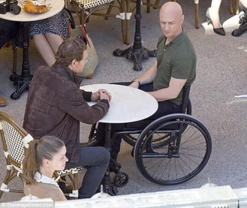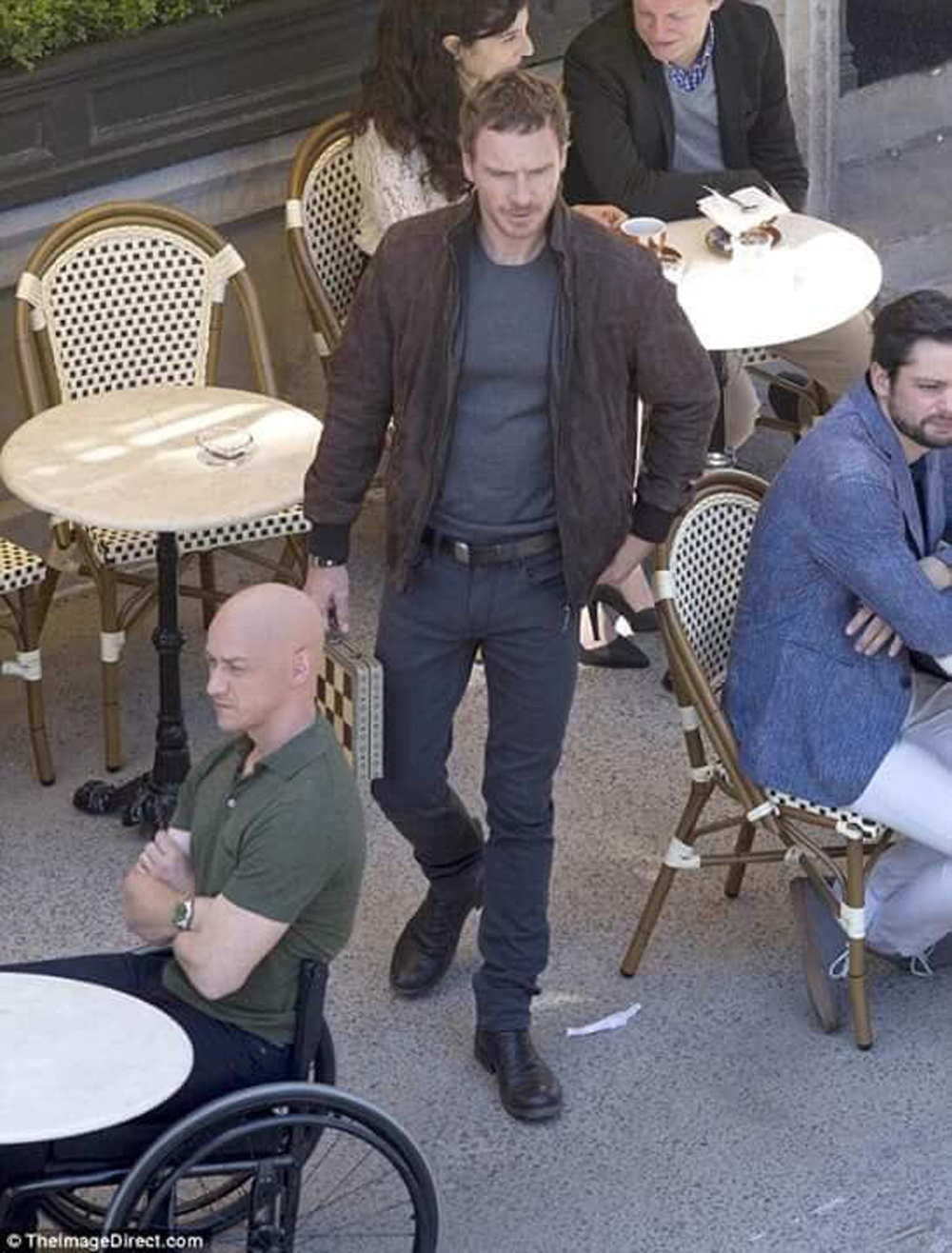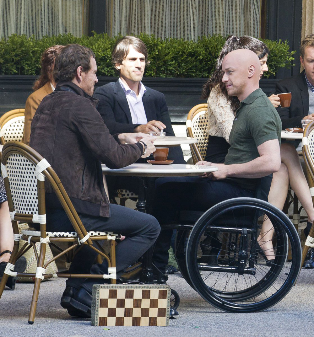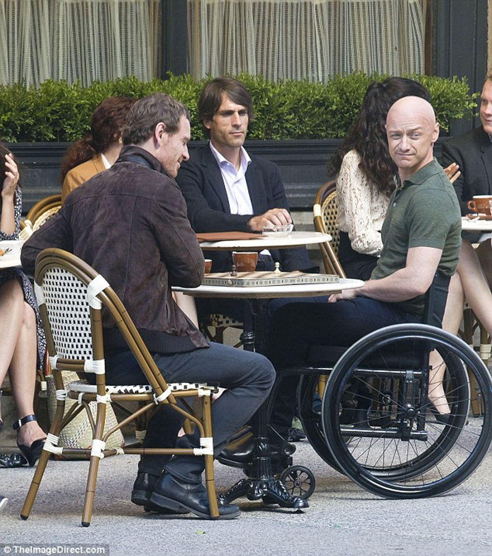 На новых снимках мы можем наблюдать за тем, как Чарльз Ксавьер/ Профессор Икс (МакЭвой) и Эрик Леншер/ Магнето (Фассбендер) общаются в кафе: