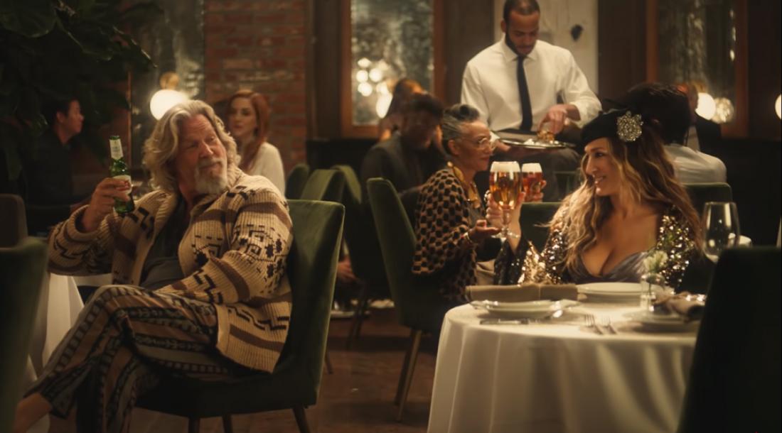 По сюжету ролика культовые герои оказываются в одном ресторане. Как известно, Кэрри традиционно заказывает коктейль Cosmopolitan, а «Чувак» — «Белого русского», однако тут вдруг они отдают предпочтение пиву Stella Artois. Собственно, это реклама именно этого продукта.
