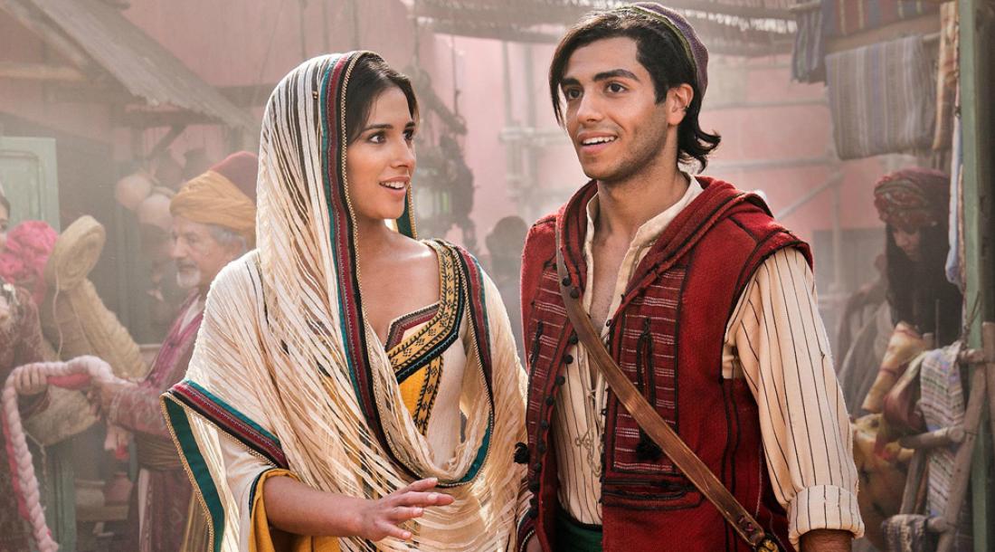 На этом снимке нам показали первую встречу будущих возлюбленных Аладдина (Мена Массуд) и принцессы Жасмин (Наоми Скотт):