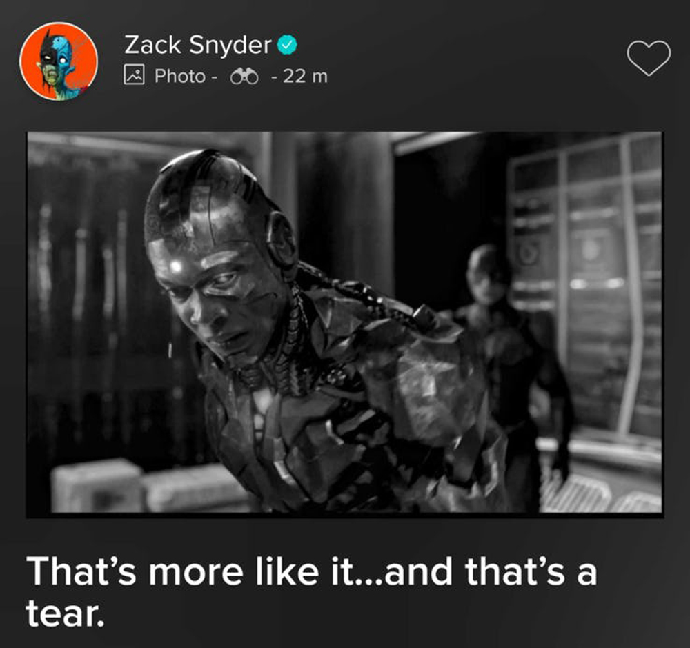 Зак Снайдер продолжает активно дразнить поклонников кадрами, которые так и не вошли в фильм «Лига справедливости». На этот раз он поделился снимком с Киборгом.